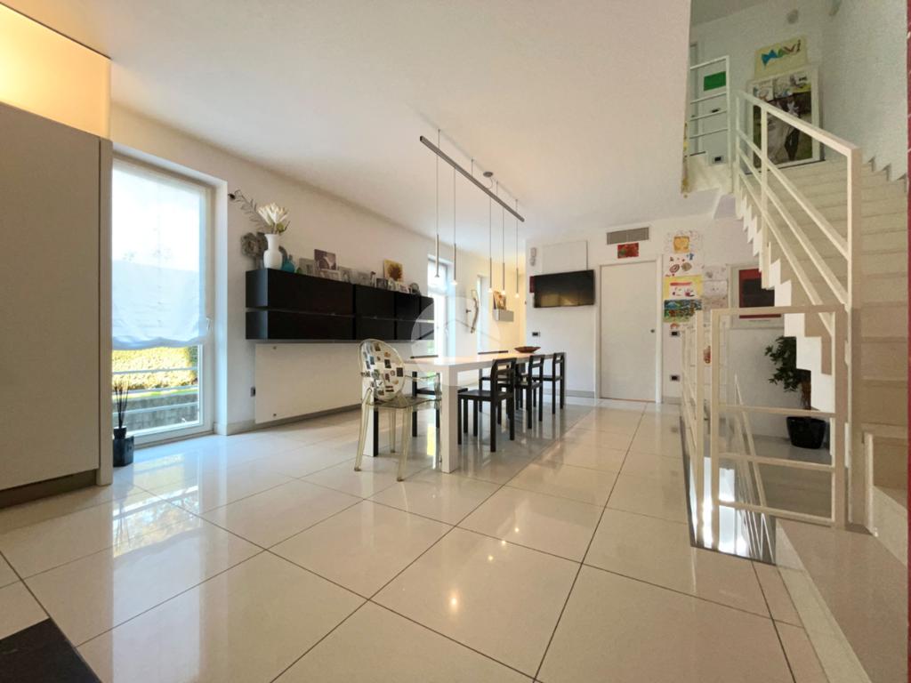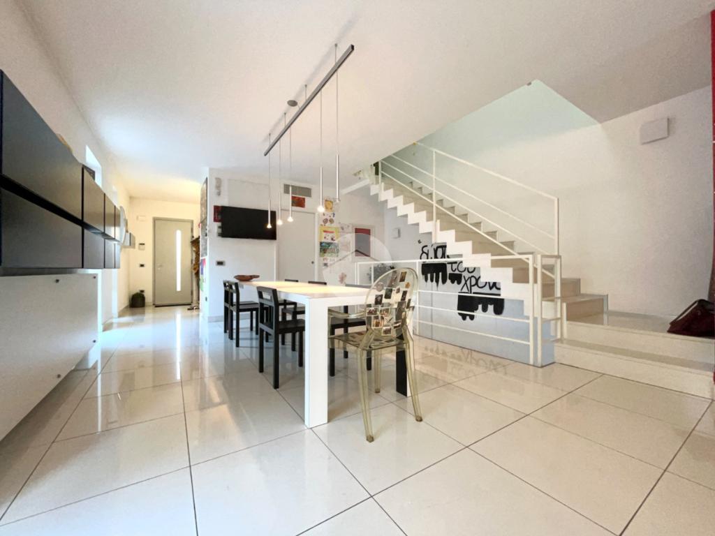 Dall'ingresso si accede direttamente a un'ampia e luminosa sala da pranzo con cucina a vista e con ampie vetrate che danno accesso alla parte laterale e restostante dell'immobile. Sempre al piano troviamo bagno finestrato e ripostiglio.